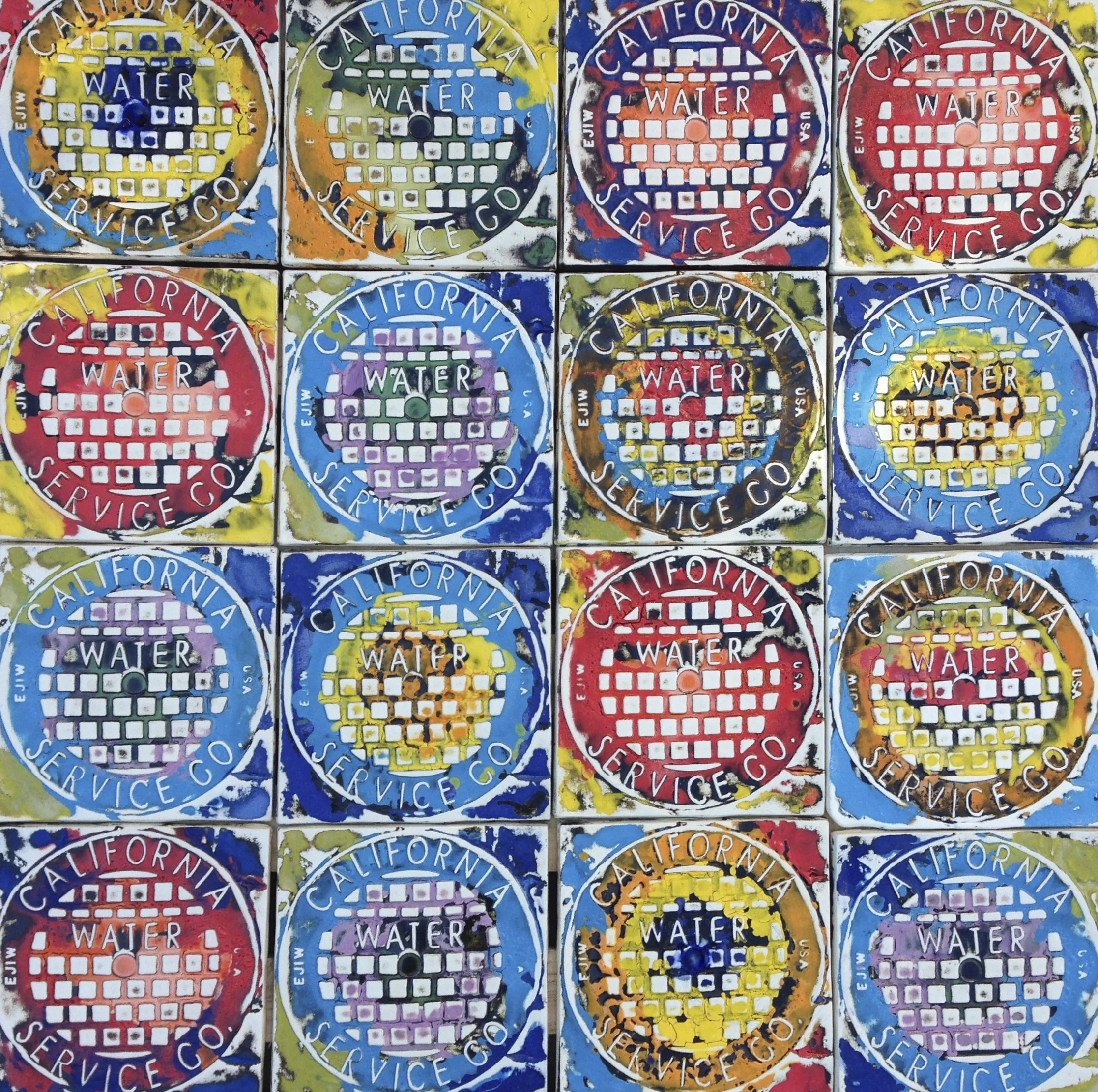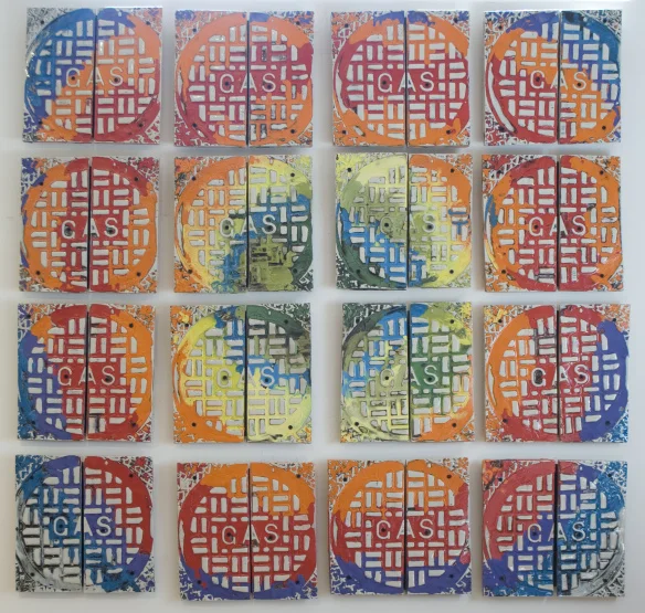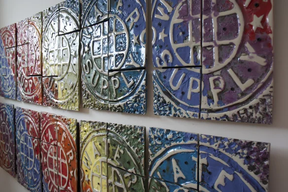 I fell in love with manhole covers many years ago, finding great beauty in these old industrial objects. I started by taking graphite rubbings and ended up with slabs of clay in the trunk of my car. I love color in all forms, and particularly here combined with designs made for iron and city streets. I have collected impressions of covers from DC, New York, Baltimore, Pittsburgh, Santa Fe, and California. I like the iconic nature of repetition in the large wall pieces. I have installations in the New York TImes building in New York City, the BG Global building in Huston and many private homes.